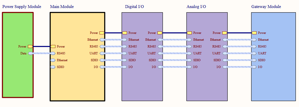Solid PAC main unit is designed based on the ARM Cortex processors with Linux and Android OS. For the special cases where the user needs more I/O and ports, we have considered the extra ports on the side unit. One or more side units can be cascaded to the main unit to supply enough required I/O and communication ports like CAN Bus, ModBus, EtherCAT, RS232. We have designed Digital I/O and Analog I/O side units separately. We have shown the connection structure here: